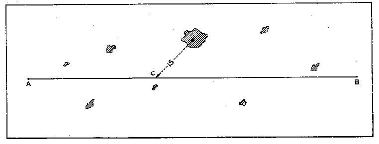 It was soon realised that straightforward map-reading by H2S was quite out of the question. The picture was not easy to interpret, particularly in industrial areas, and it was decided that fixes by bearing and distance should only be obtained from really large towns or from well isolated smaller towns. The basis should be good D.R. navigation, the navigator working out an E.T.A. for a position where the next large town will be within range. Thus in Figure 38 an aircraft is assumed to be flying from A to B. The navigator will work out an E.T.A. for the position B in the usual way, but will also calculate the E.T.A. for position C. He will ignore the smaller towns en route as they may be misleading and on E.T.A. will search the PPI for a large town 15 miles on the port bow. The time taken from A to C will not be more than 15 minutes, and unless something very unusual happens the aircraft will certainly be within 10 miles of C. There is only one large town in the area and if he locates a built-up area at 10 miles and almost straight ahead, he is justified in assuming that this is the town and that the wind used is incorrect. As an additional check it might be possible to identify the small town south of C by its position relative to the large town. Having made the identification it is a simple matter to take a range and bearing, thus obtaining a first-class fix, on the basis of which the D.R. can be corrected and an E.T.A. worked out for the next large town.