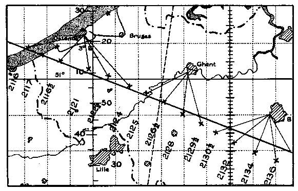 Basically, the present-day system is much the same. The main improvement has been effected in modifying the task of the set operator, reducing the possibility of incorrect identification. He is provided with a board on which is affixed a section of the standard plotting chart covering the route. The required track is drawn in, as shown in Figure 39, which is an extract from such a chart.