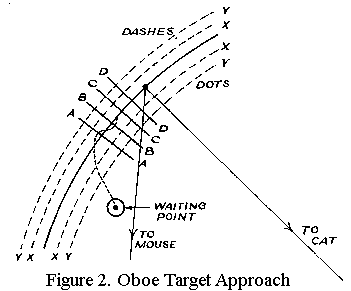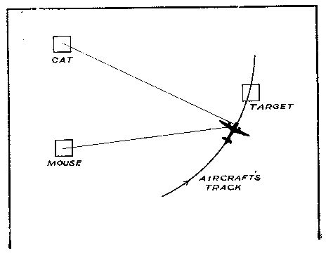The Oboe system as at present operated is one in which an aircraft is controlled by range measurements from two ground radar stations. These two ground stations transmit pulses on the same radio frequency but on different pulse recurrence frequencies and the aircraft carries a pulse repeater to provide adequate signal strength of the return pulse at the ground stations over great distances. The controlled aircraft flies at constant range measured by normal radar methods from one station (the "Cat" or "Tracking" station) such that the track will take it directly over the target (see Fig.1). At the other ground station (the "Mouse" or "Releasing" station) located some considerable distance from the "Cat", the aircraft's range and the component of ground speed along the line joining ground station to aircraft are measured; from these measurements, in conjunction with a knowledge of the ballistic data of the bomb and the prearranged height and airspeed of the aircraft, the point at which the aircraft must