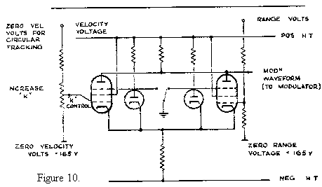 In circular tracking, the depth of modulation depends only on the position of the aircraft with respect to the target. Thus if we fix the velocity voltage to that corresponding to that of zero velocity or range, the direction of the current flowing through the relay depends on the range volts. In other words, the value of the range volts determines which of the two valves in the electrical balance is conducting more highly than the other.