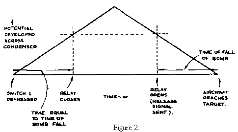 Let us now see how the electrical instrument predicts this instant of bomb release. When the aircraft signal passes pulse 2, a switch is pressed causing a condenser to charge - linearly in the manner shown by Fig. 2. After a time of T seconds (equal to the time of Figure 2. fall of the bomb) the potential reached by the condenser causes a relay to close. The condenser still increases its potential until the signal is coincident with pulse 4 when a second switch is depressed causing the condenser to discharge at the same rate as it was charged. When the potential, at which the relay closed, is reached, the relay now opens, sending a bomb release signal to the aircraft. By examination of Fig.2 it will be seen that this signal is sent out T seconds before the aircraft reaches the target.