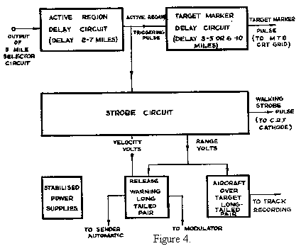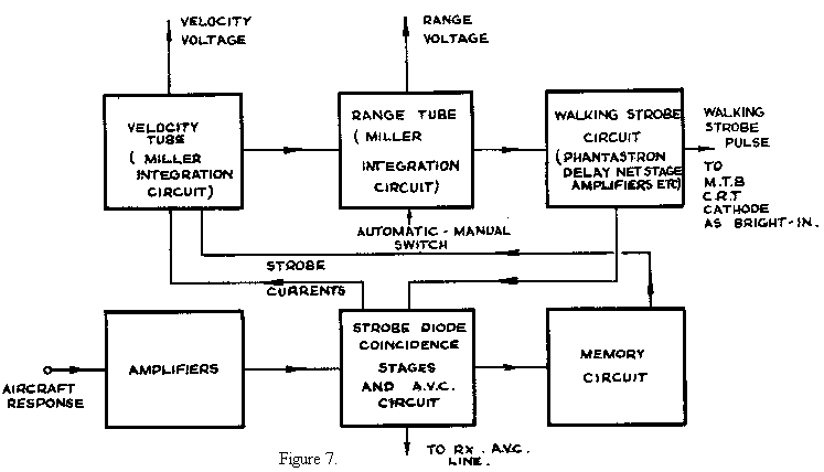 Let us assume a signal is present on the active region. This is fed to the coincident stages via amplifiers and now let us adjust the range voltage by means of the manual controls on the instrument so that the strobes overlap the aircraft signal. Strobe currents are immediately produced which are fed into the grid of the velocity tube, causing its anode voltage to fluctuate. But the, anode voltage of this stage is integrated by the range tube, if the "Auto Manual" switch is turned back to the "Auto" position. Thus the fluctuation of the anode voltage of the velocity tube will cause a phase shift of the walking strobe which will continue until the aircraft signal and strobes are correctly locked. When this occurs the residual strobe current fed into the grid of the velocity tube will be zero, and on account of the nature of the circuit, the anode voltage will remain constant so long as the tube speed of the aircraft remains constant.