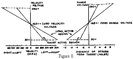 When the length,of the active region is changed, the grid leak of the phantastron in the walking strobe circuit is altered in value and this either halves or doubles the sensitivity of both the range and velocity voltages. (See Fig.8).
