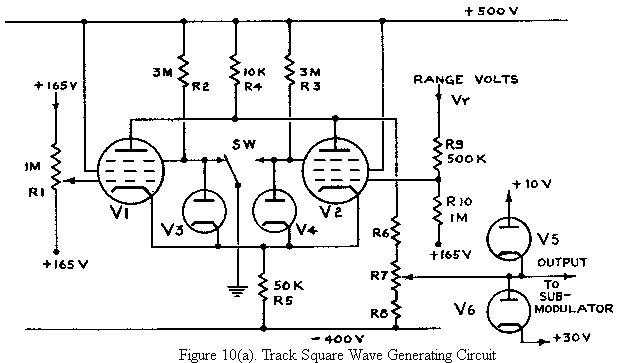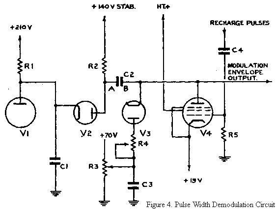 The anode voltage is too high to be of use but a suitable voltage is obtained from the slider of potentiometer R7. The two diodes V5, V6 limit the output voltage swing applied to the width modulator of the transmitter to the range +10V to +30V. An output of 10V causes the production of 4 μS pulses and an output of 30V the production of 1 μS pulses. The slider of R7 is adjusted so that when the grid potentials of V1 and V2 are both +165V, the output voltage is 10V, with valve V5 removed. This ensures an on-track pulse width of 4 μS. When the range volts differ from +165V the voltage at the slider of R7 would, in the absence of V5, swing above and below +10V. The presence of V5 eliminates voltage swings below 10V thus ensuring that the mark constituting pulses are of 4 μS duration.
