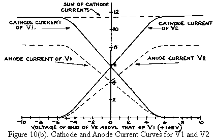 It can be seen that when the two grids are at equal potentials the two anode currents are equal (this assumes balanced valves and other components) and that for small inequalities of grid volts the valve with the higher grid potential carries an anode current greater than that of the other by an amount roughly proportional to the grid volts difference.