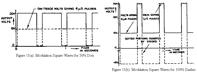The waveforms shown in Fig. 11 are the output square waves obtained for an aircraft (a) 0.1 mile inside the track circle (b) 0.25 mile or more outside the track circle. The dotted parts of the waveforms indicate portions removed by the limiting diodes V5 and v6. The two chosen distances off track correspond to 50% dot and 100% dash modulation as shown in Fig.2 in the section 4.2 on width modulation.