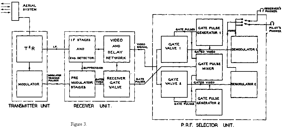 Fig. 3 shows a block diagram of the latest airborne equipment. Common T & R is used and the same wide angle aerial serves for reception from and transmission to, both ground stations. There are two outputs from the receiver. The first of these feeds the P.R.F. selector with all received signals, the second passes on signals of selected P.R.F. to modulate the transmitter.
