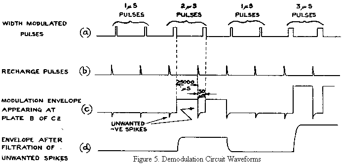 The unwanted negative-going spikes are of about 50 μS duration but with the normal P.R.F's, used they are spaced about 5000 - 10,000 μS apart. They are therefore readily removed by a low pass filter without serious detriment to the envelope to be extracted, Fig.5(d).