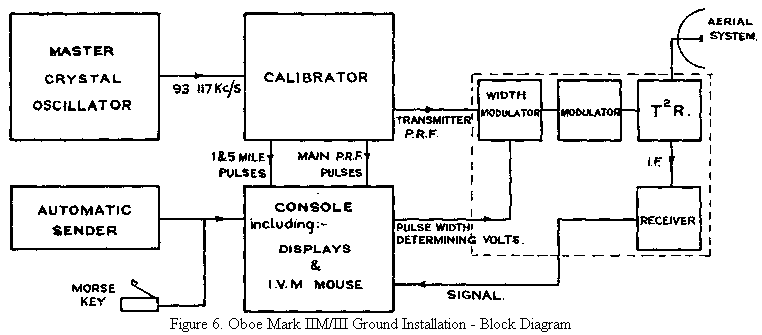 Having once ensured that centimetre waves were suitable for Oboe, a system had to be devised utilising this waveband. An airborne transmitter and receiver had to be designed along lines suitable for a moderate production programme. These could simply replace the 200 Mc/s transmitter and receiver in the aircraft. On the ground, a station could be made by exchanging the transmitter, receiver and aerial system of a Mark I station for their 10 centimetre equivalents. This step was actually taken at the time when jamming of Mark I became acute, the resultant ground stations being known as Mark IIF.