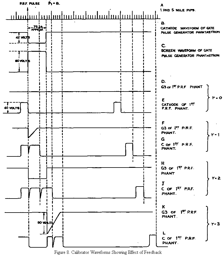Fig. 8 shows at A a series of 1 and 5 mile pulses, one of which corresponds to a P.R.F. pulse. At B and C are shown the corresponding cathode and screen waveforms respectively of V2. The remainder of Fig. 8 shows how cases (a) (b) (c) and (d) above, give values of r equal to 0, 1, 2 and 3 respectively.