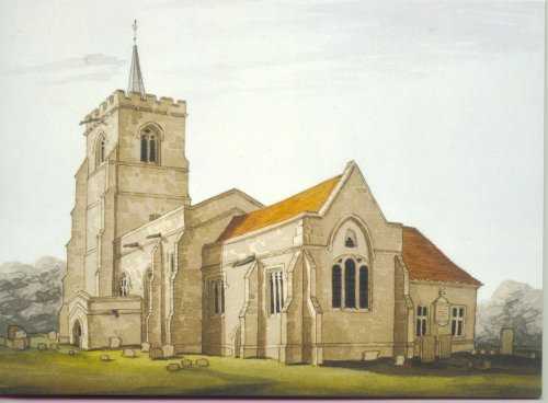 The West Tower was built in the 15th Century, at which time the south wall was rebuilt. In the mid 1850’s many churches were in a sad, neglected state and the unsatisfactory condition of All Saints was deeply deplored. An article published in the Northampton Mercury on 15th January 1853 described the interior as “dirty and decayed”. The Lay Rector’s seat was softly cushioned, contrasting strongly with the dingy appearance elsewhere in the building. In the belfry reposed a bath, purchased for the use of the parishioners when the cholera raged (Bedford had an epidemic in 1849). Windows were blocked up in the Porch and a family vault marred one of the windows in the Aisle. A copy of a painting of the Church in 1815 by Thomas Fisher is shown below - the original is in the Luton Museum.