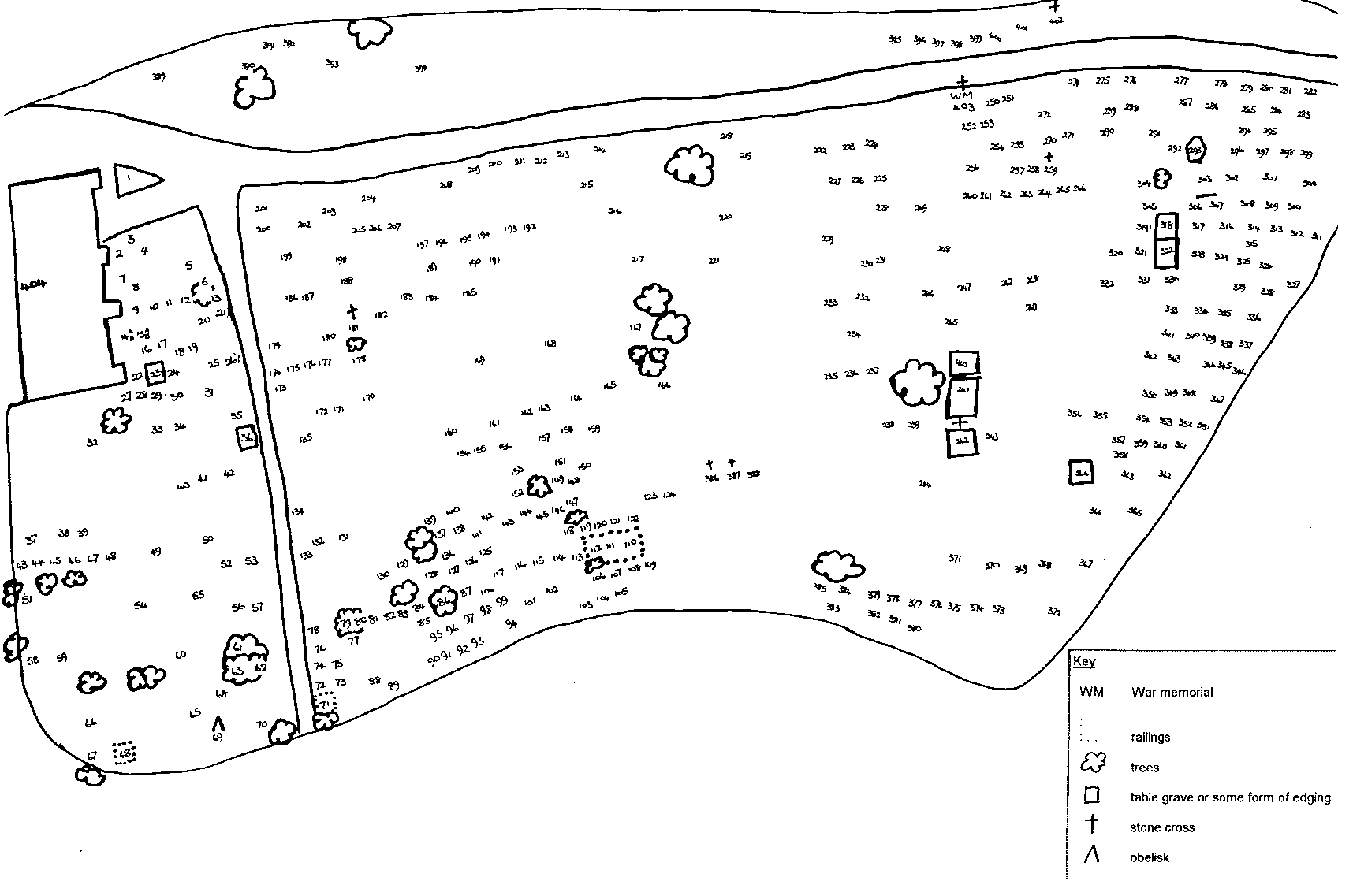 Capitalisation has been sacrificed for speed. Punctuation, where it is included, is correct; but because full stops, commas, etc. are often worn and easily missed, where none appears in the following, it should not be assumed that there was nothing on the stone originally. Layout is as it appears on the original stone. Verses have been transcribed, where readable or when time permitted; when not transcribed this is shown. Photographs of nearly all these graves are available, please see the Rosedale Grave Photographs page. All names on gravestones have been indexed. Dates given in the index are to help narrow down the search; dates are either the date of death or of burial, there being no date implies that the person is mentioned on the stone, but not commemorated.