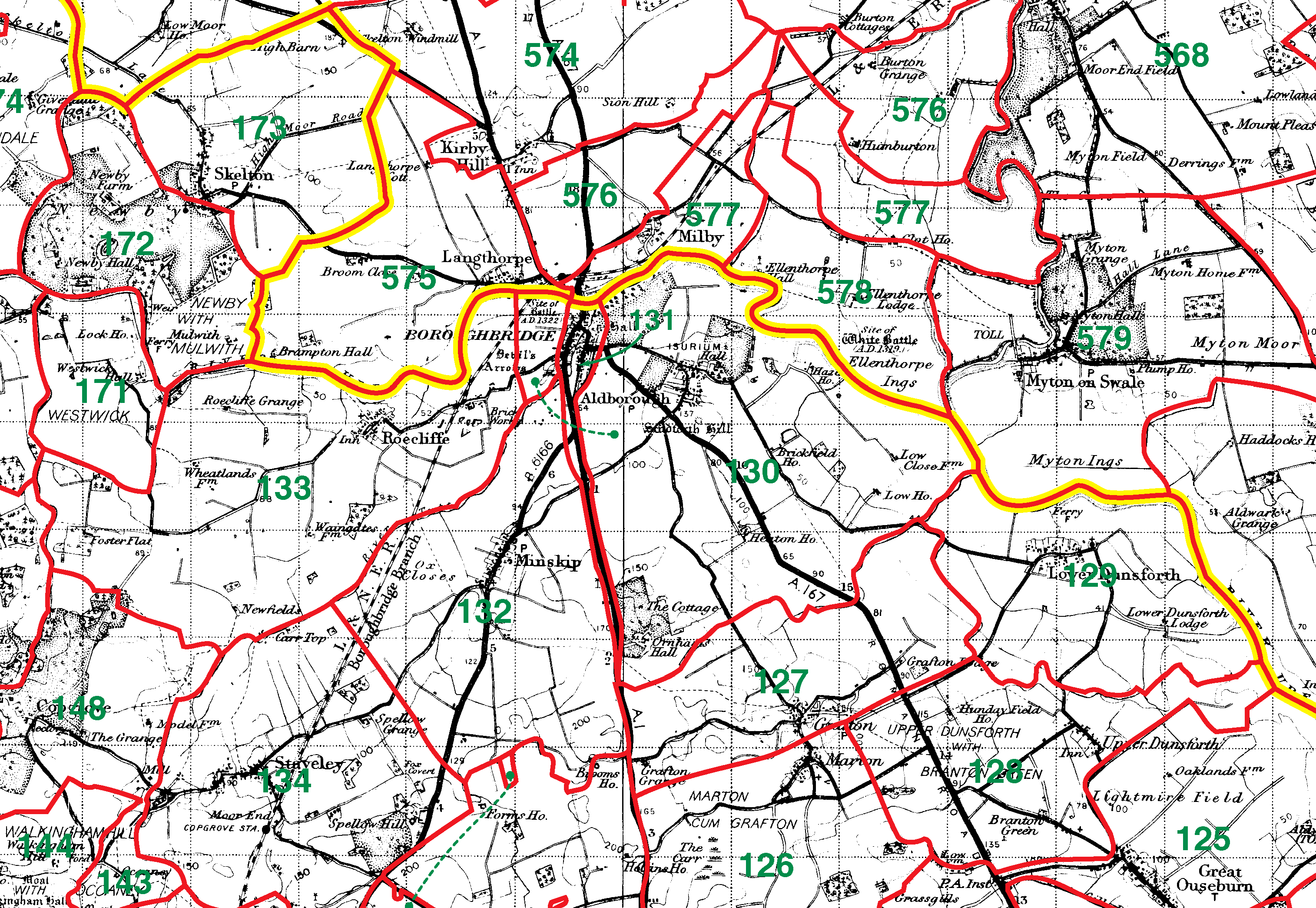 578=Ellenthorpe | 128=Upper Dunsforth with Branton | 129=Lower Dunsforth | 130=Aldborough | 131=Boroughbridge |