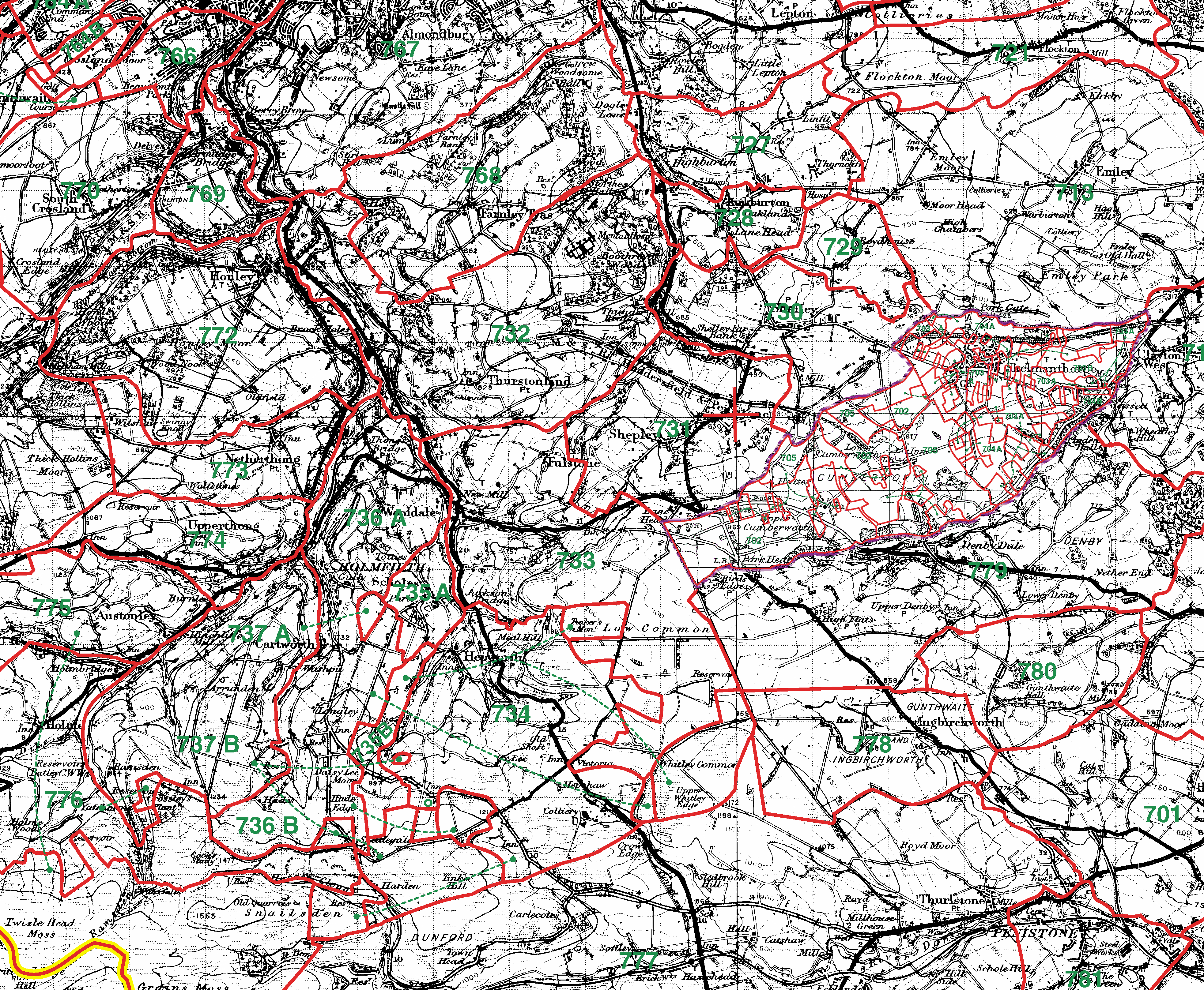 731=Shepley | 732=Thurstonland | 733=Fulstone | 734=Hepworth | 735A=Scholes |