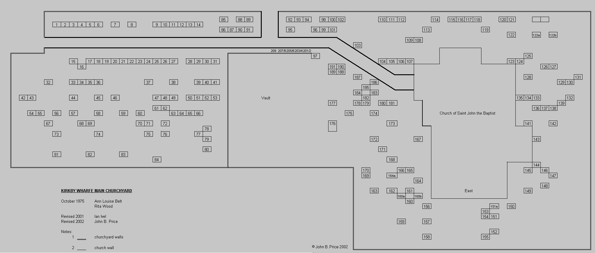 The results of this work were placed with the Borthwick and with the York FHS. The copies with the Borthwick appear to have laid untouched, however it has been verified that they are still there. The copies with the York FHS appear to have suffered a similar fate. Early in 2002, John Price (in Louisiana, USA) wrote to me saying that he had a copy of the MIs which he had transcribed into spreadsheet format and would I be interested in placing them on the Genuki site. I replied saying that I would indeed be interested and he sent me a copy of his files. As these were not in a format I could easily deal with, I asked if he could change the format for me. John said that he was prepared to do the work required and on a visit to the UK, he checked the stones and re-formatted all the transcriptions so that what you see on the web pages is how they appear on the gravestones. John also added the many MIs from the churchyard extension and asked that the following paragraph be included: